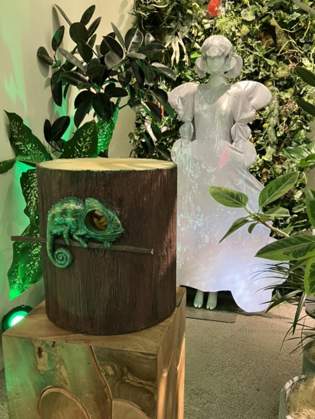 緑の中にあるグレーのドレスが「消える」楽しみと驚きを演出しています。