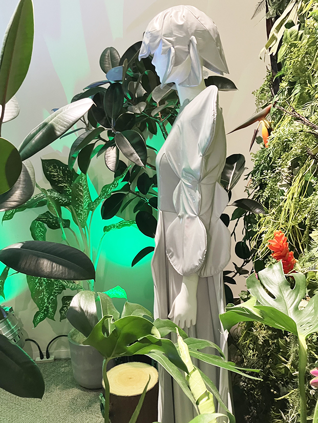 再帰性反射生地にプロジェクションマッピングのように植物映像を投影することで「透明」を表現した服。