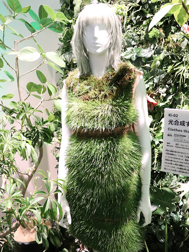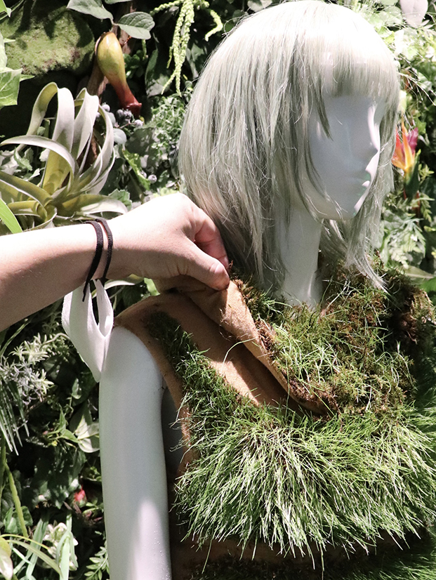 布地に植物を植え付けるなどして自然との共生を表現した服。
